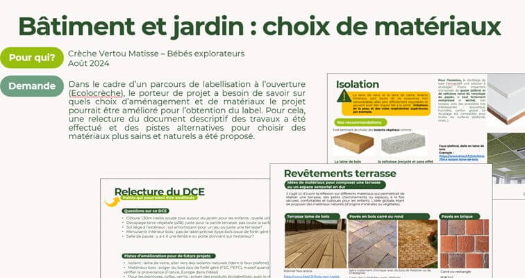Notre équipe pluridisciplinaire intervient sur différents sujets autour de l’environnement et de la qualité de l’accueil. Nous apportons notre expertise sur la santé environnementale, l’accompagnement au changement, l’alimentation durable, les bâtiments et les extérieurs.
